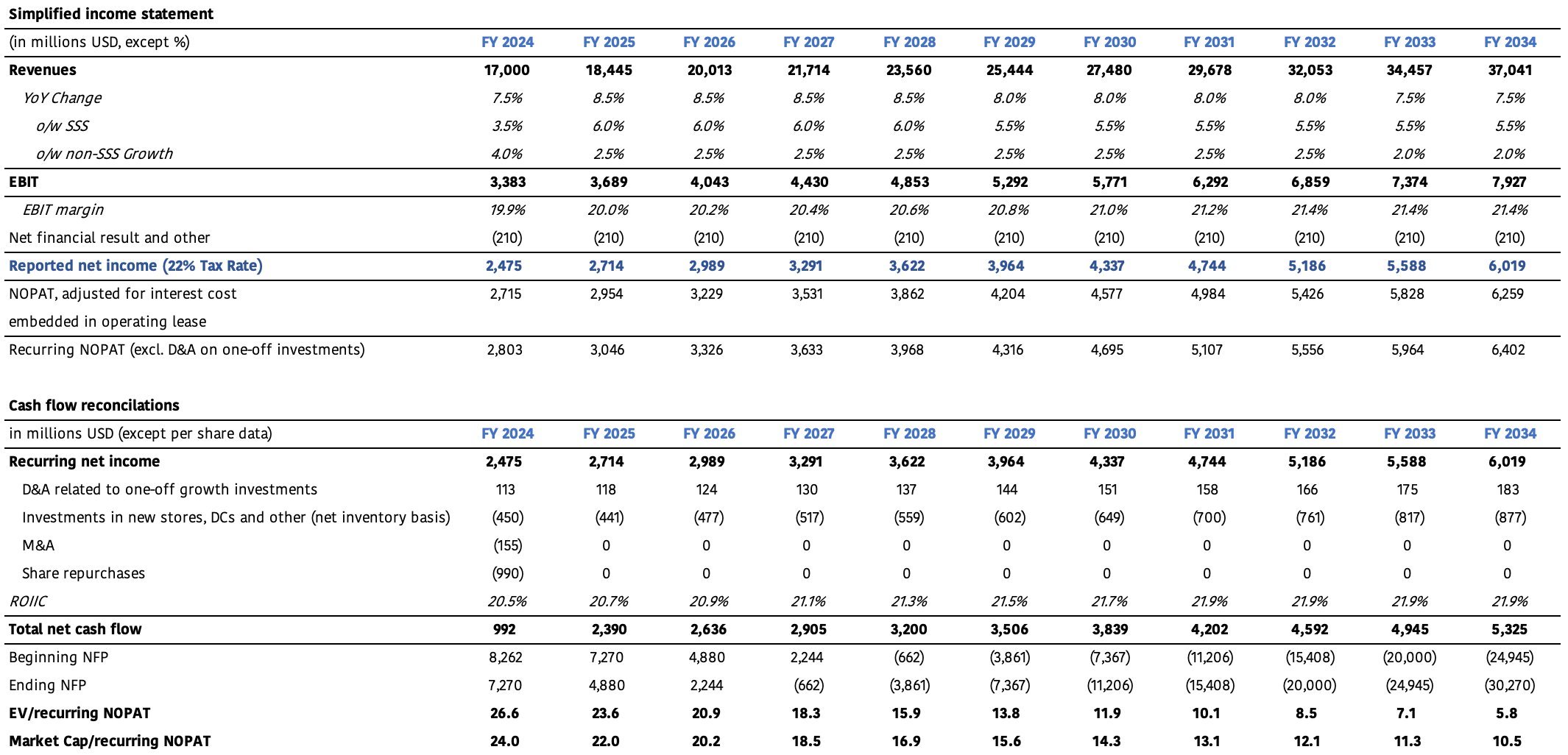 Notes: the expected CAGR is based on a 1,138 USD entry price. A positive NFP represents net debt, a negative number is net cash. The opening/beginning NFP for FY24 is based on ORLY’s adjusted debt at the end of FY23.