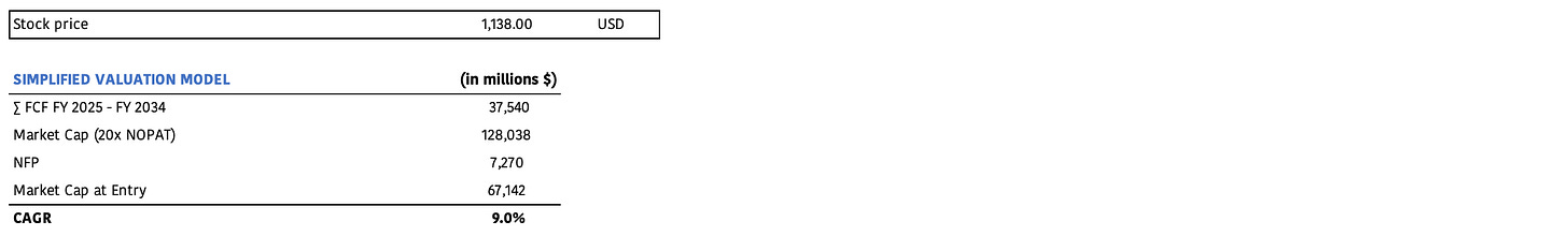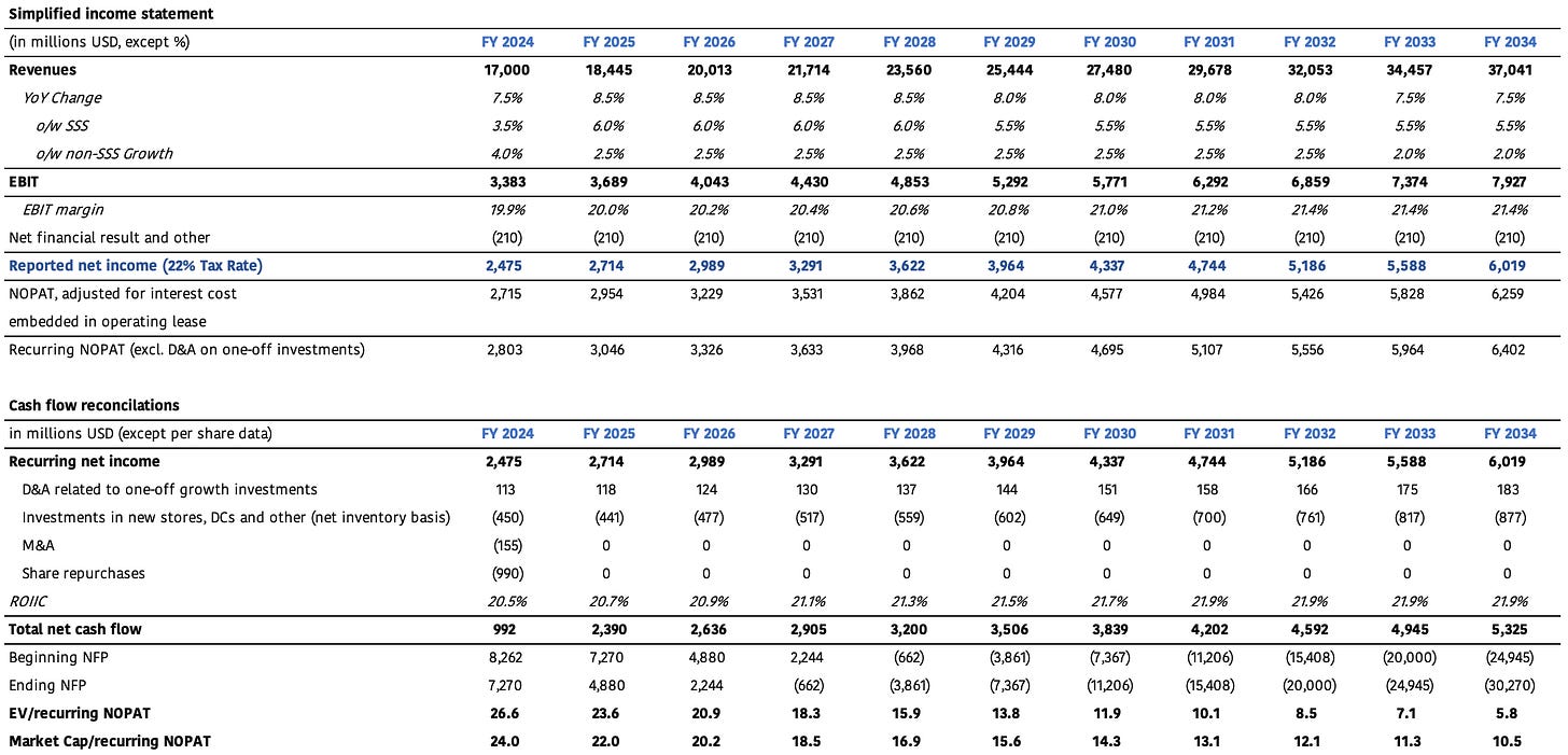 The IRR comes in at 9.0%, which is below our target of 11-12% before considering potential upside optionality. As always, this is just a model to provide a rough estimate of the returns today's valuation might yield. In ORLY’s case, several factors will influence its return: when will new stores fully contribute to overall profits? What will the country mix be? What’s the timing for new store and distribution center openings? How will geographic expansion unfold? Because of these variables, we view our IRR model as more of a ballpark estimate—a yardstick for making well-informed investment decisions, rather than a precise calculation.