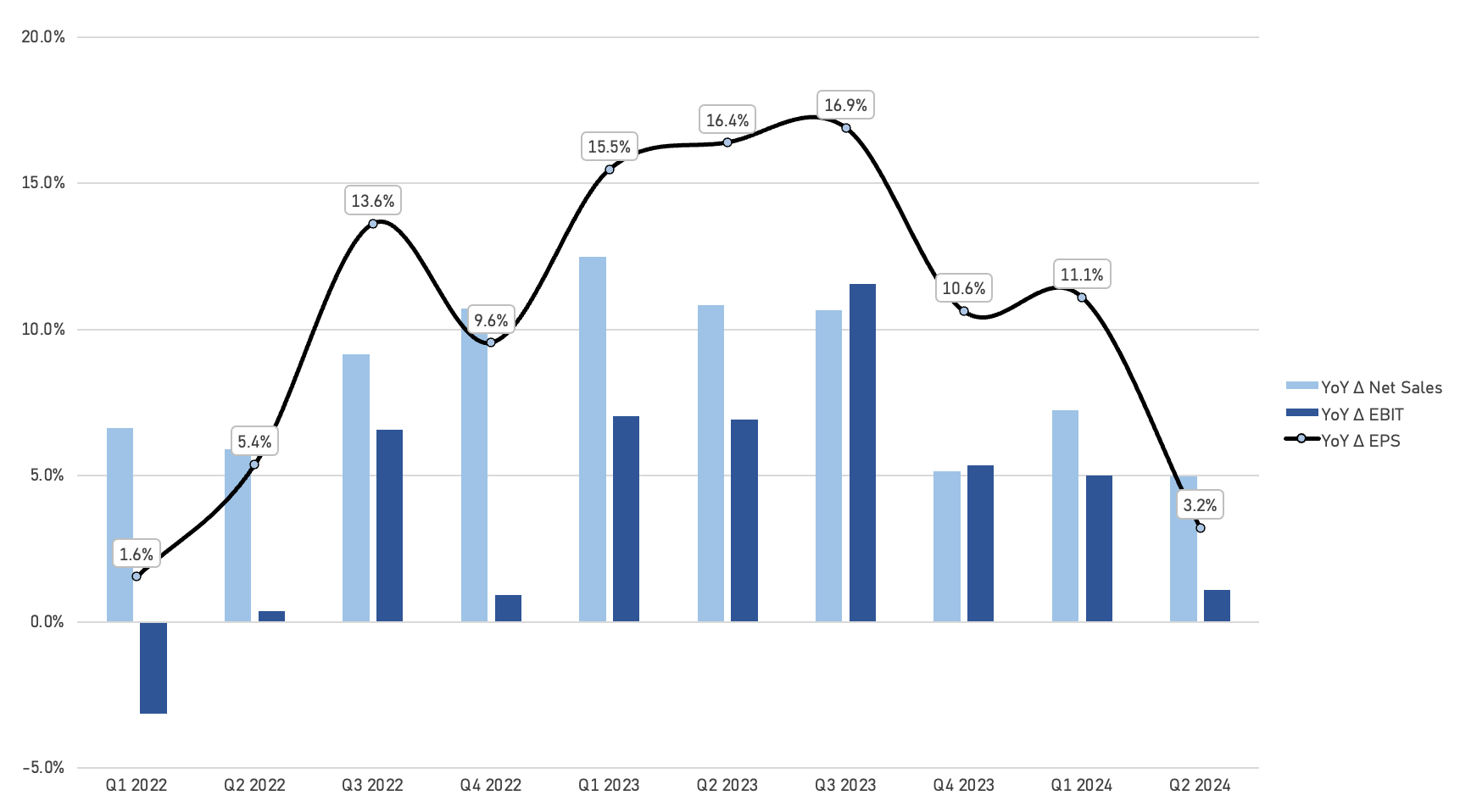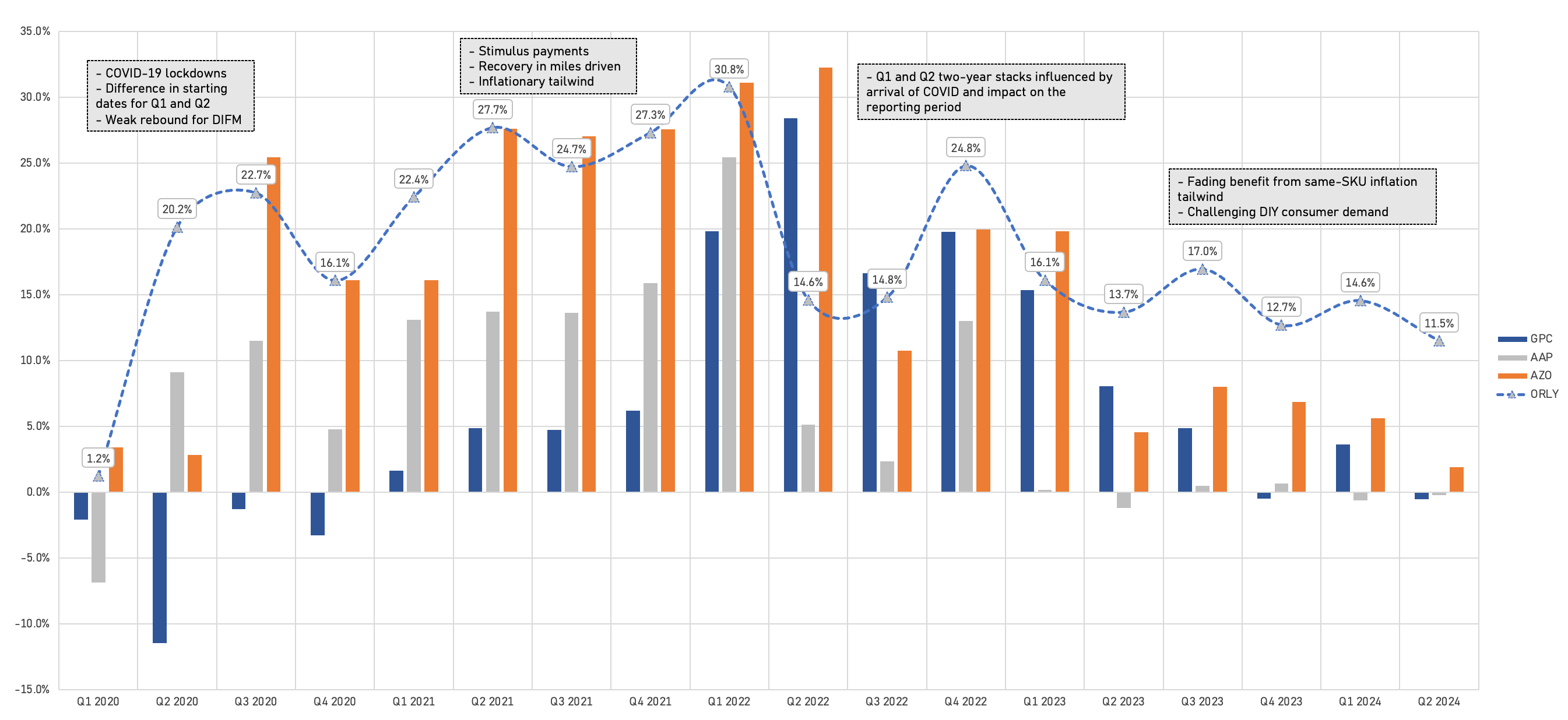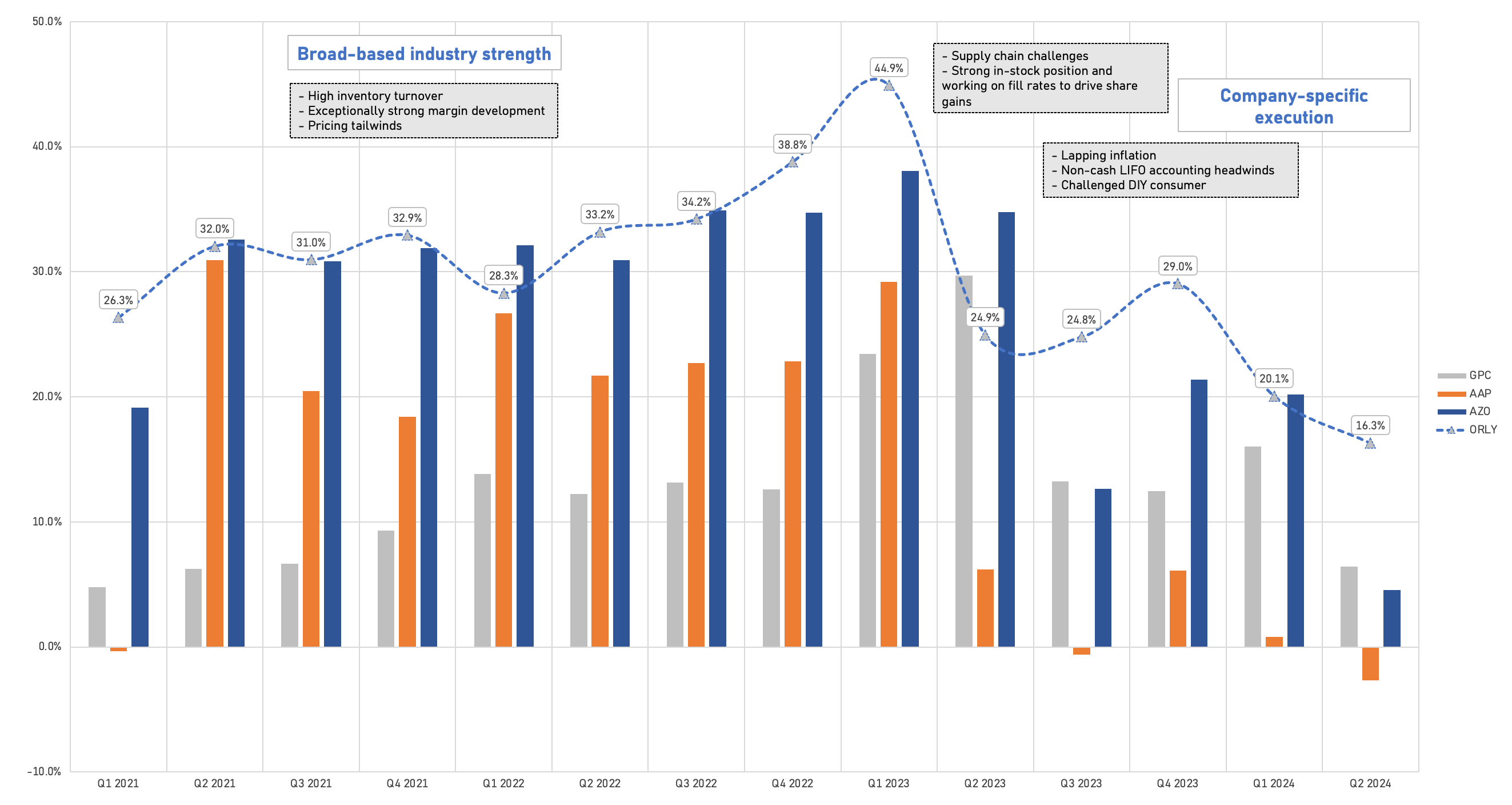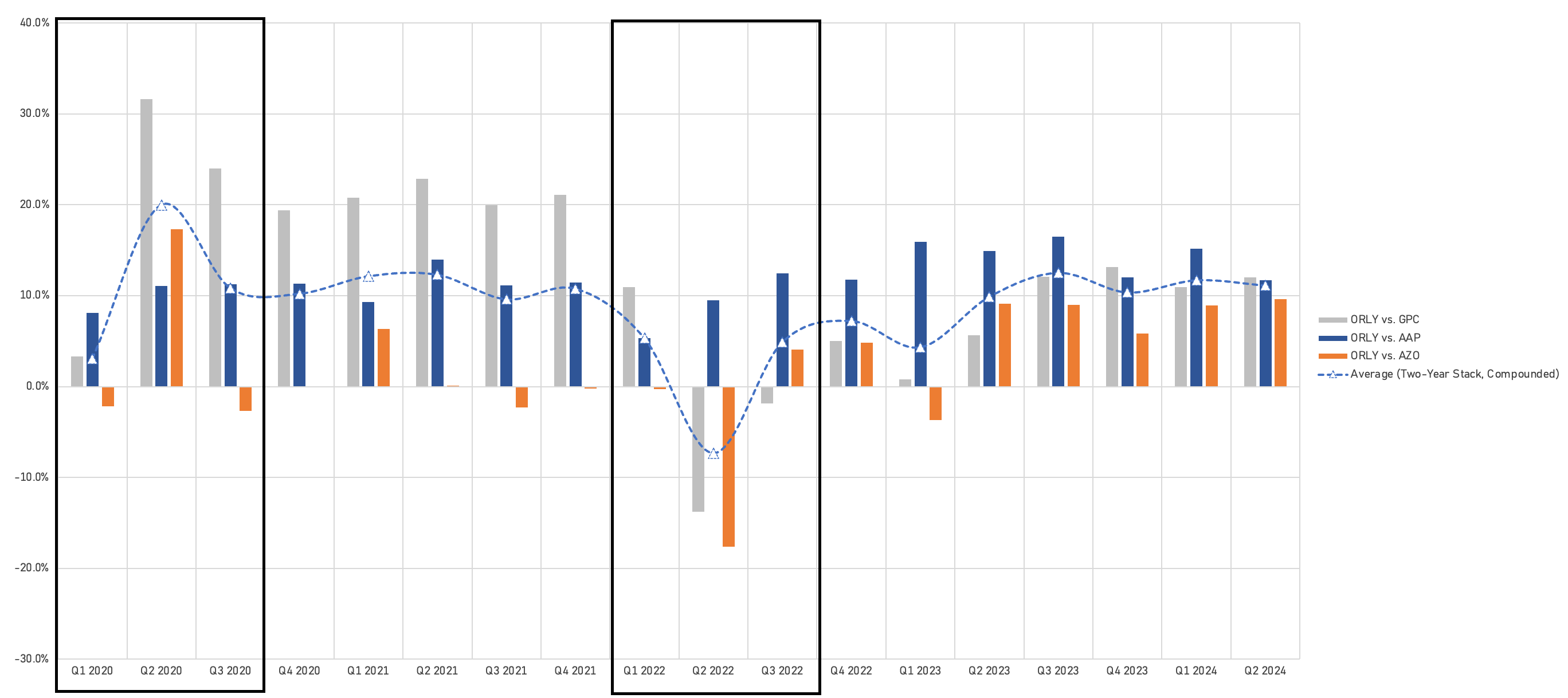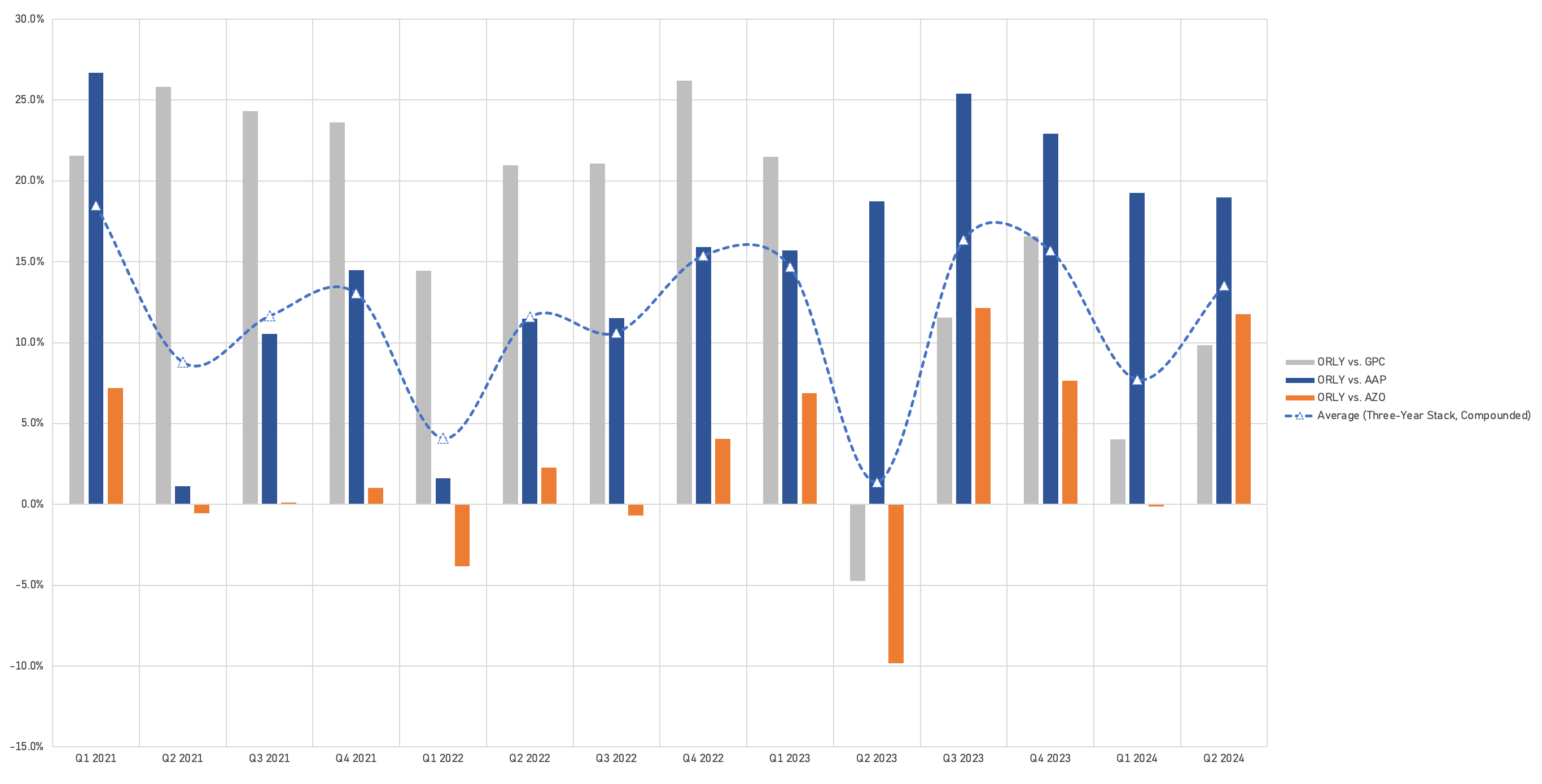 While ORLY’s growth rates have come down, we encourage investors to look at the two-year stacks (compounded) to gauge momentum relative to the industry, and to account for the high inflation comparisons of 2021, 2022 and 2023.