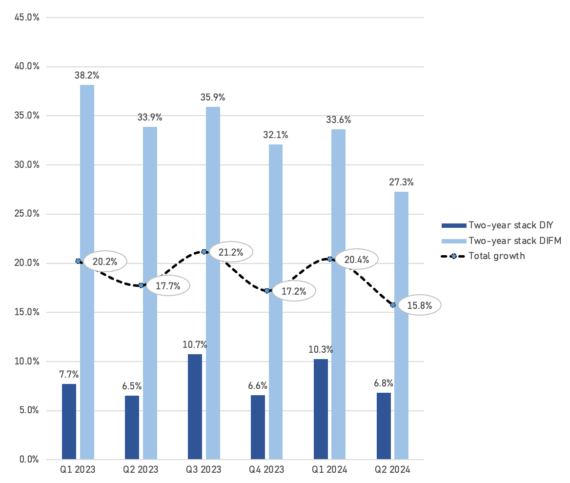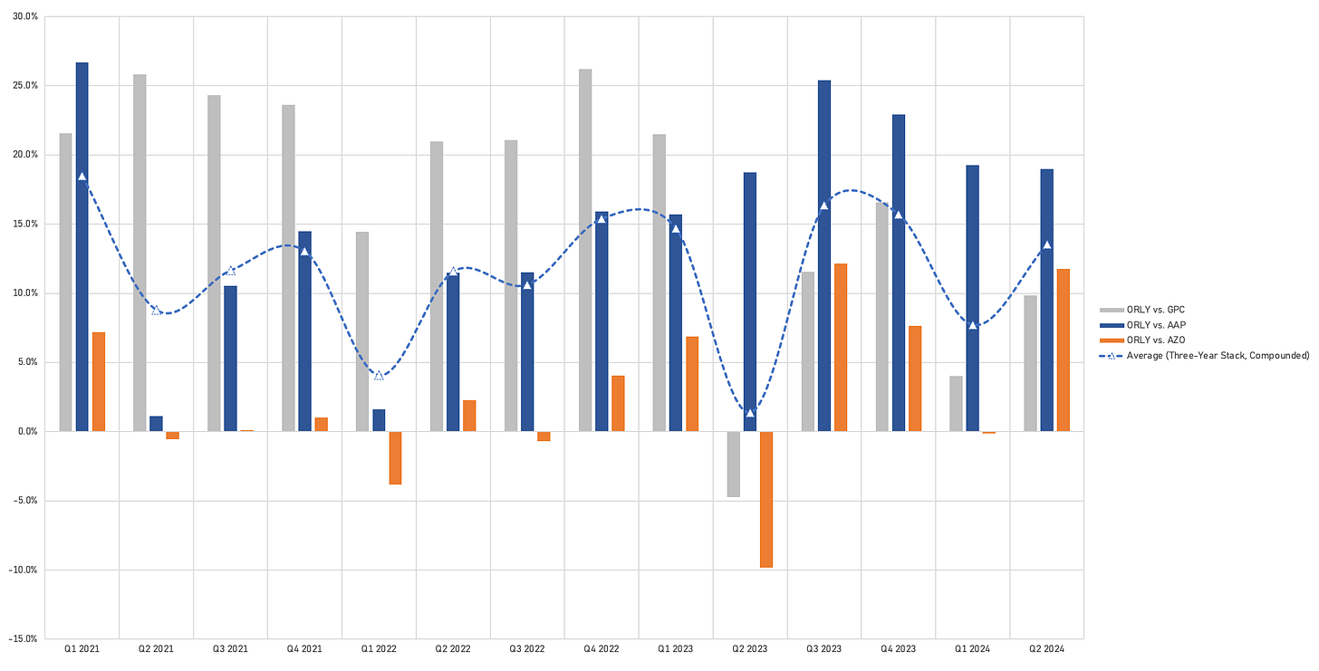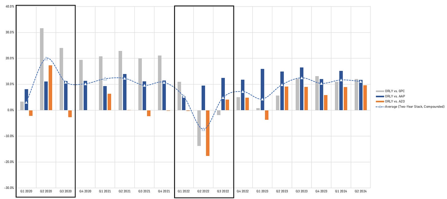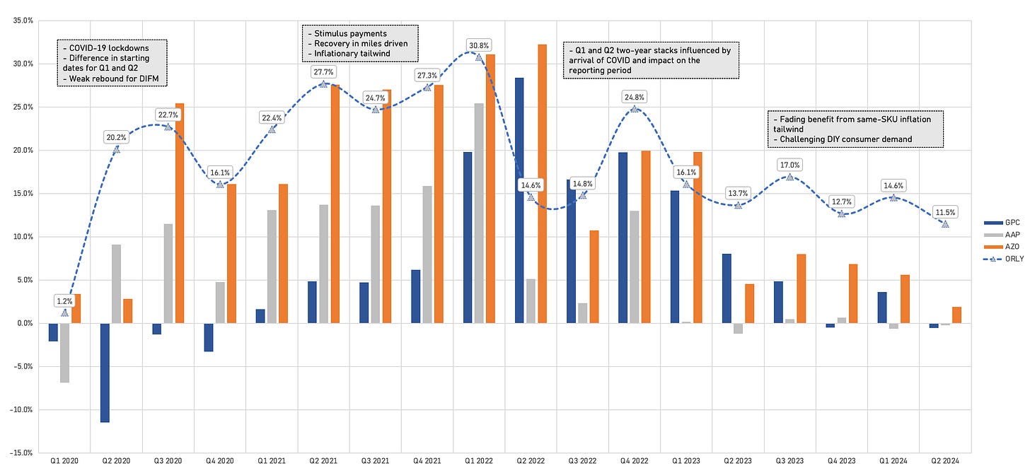 On a two-year stack basis, DIFM’s high-30% growth has moderated to 27%, driven by normalizing same-SKU inflation and the fact that ORLY’s professional sales have grown significantly. With ORLY now operating from a much larger base, the absolute dollar amount of market share gains remains strong, but the relative/percentage growth is lower.
