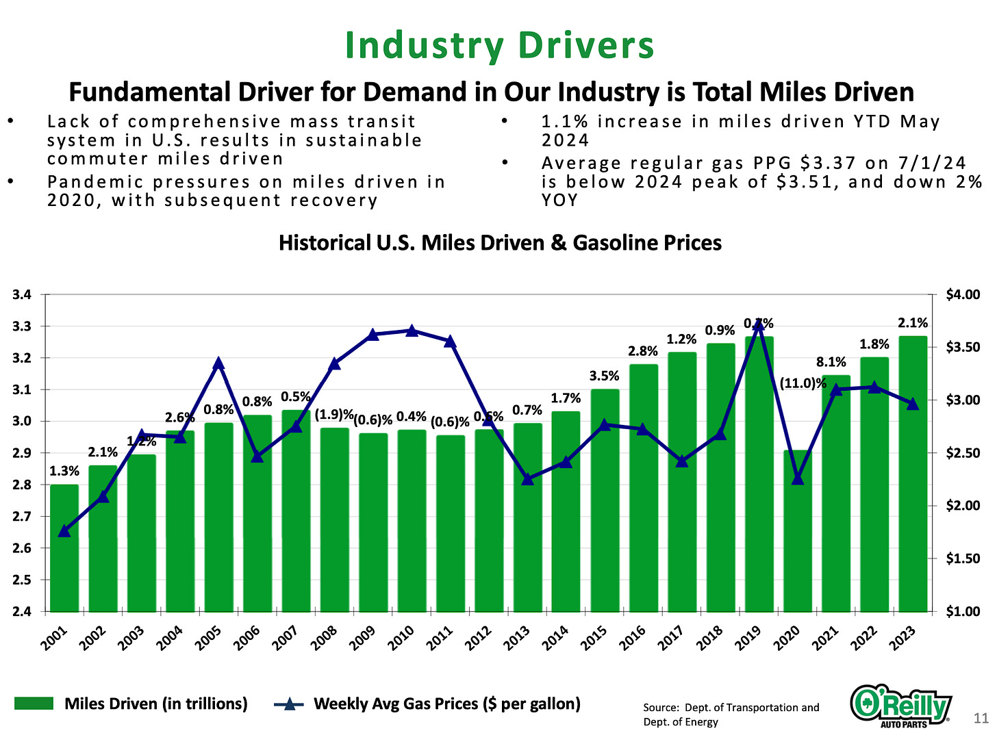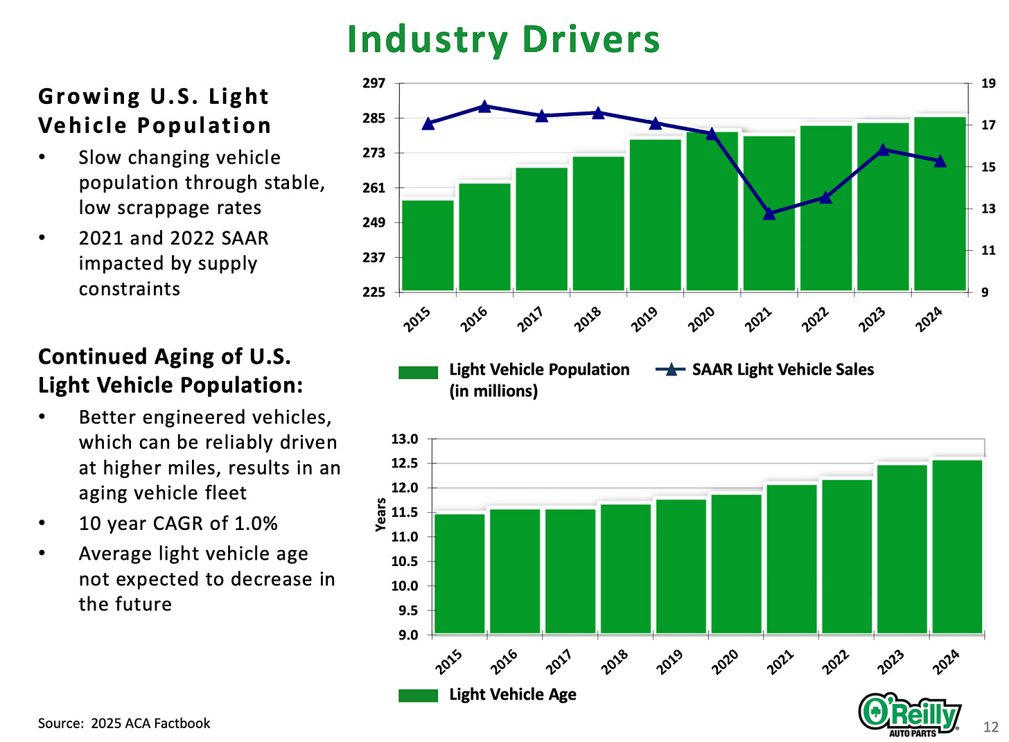 Miles driven, the supply of new car sales, used car sales, average vehicle age: they all impact the long-term growth picture for ORLY’s sector, and they’re exposed to macro events.