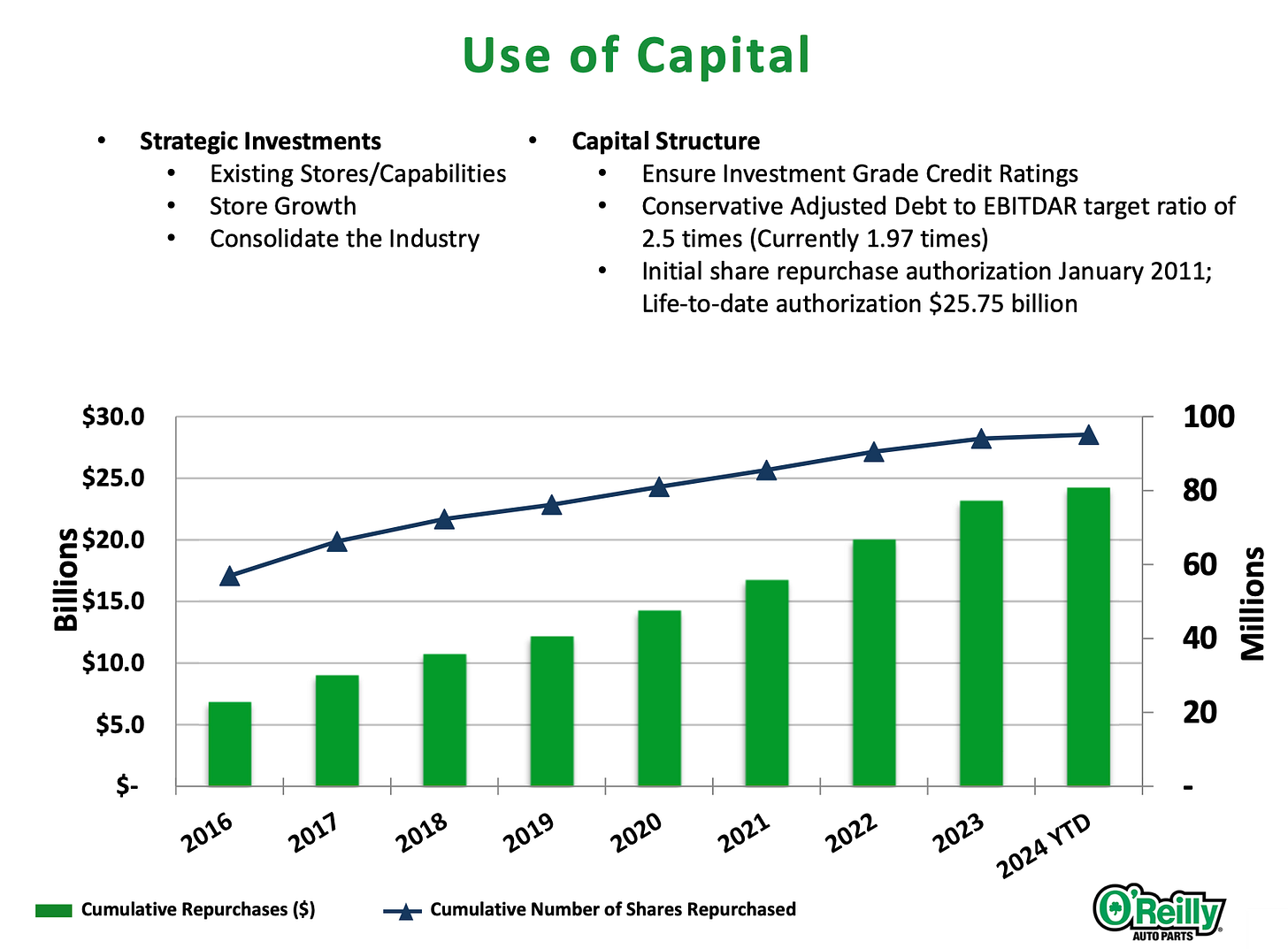 Now, we’ll complement the AutoZone deep dive with additional background on ORLY’s track record, capital allocation priorities, importance of management and highly motivated and trained professional parts people, and other qualitative aspects that have led to its to-date triumphs.