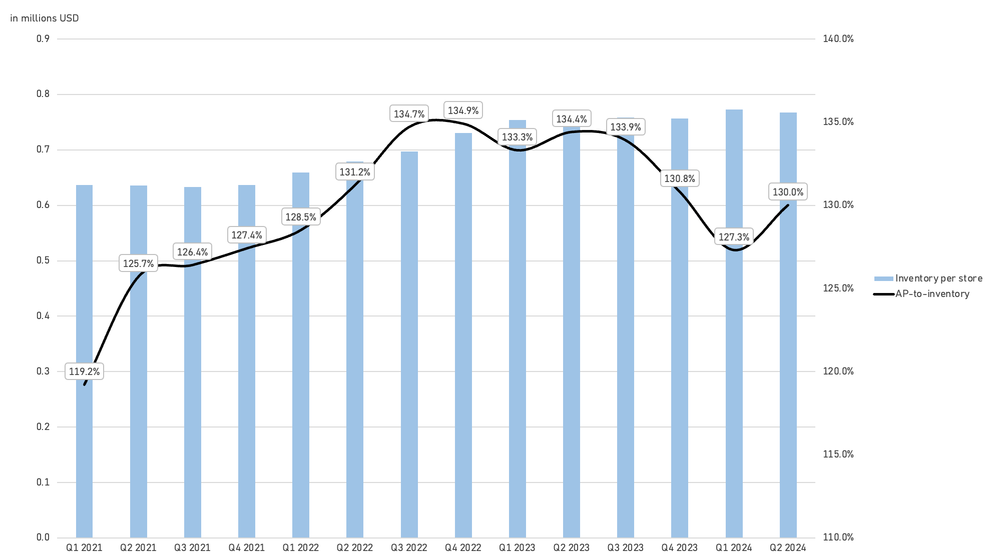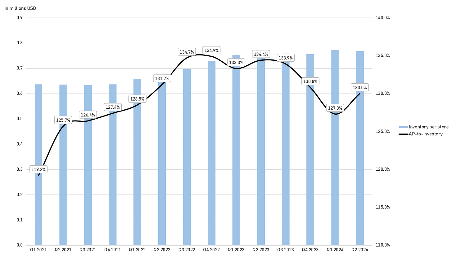 Compared to AZO, we’ve observed better performance in accounts payable for ORLY recently. While AZO’s differing quarterly reporting periods make direct comparisons challenging, we believe ORLY’s industry-leading performance in ticket counts (i.e., handling higher volumes) and the growth of its proprietary brands are the primary drivers behind its strong net inventory performance.