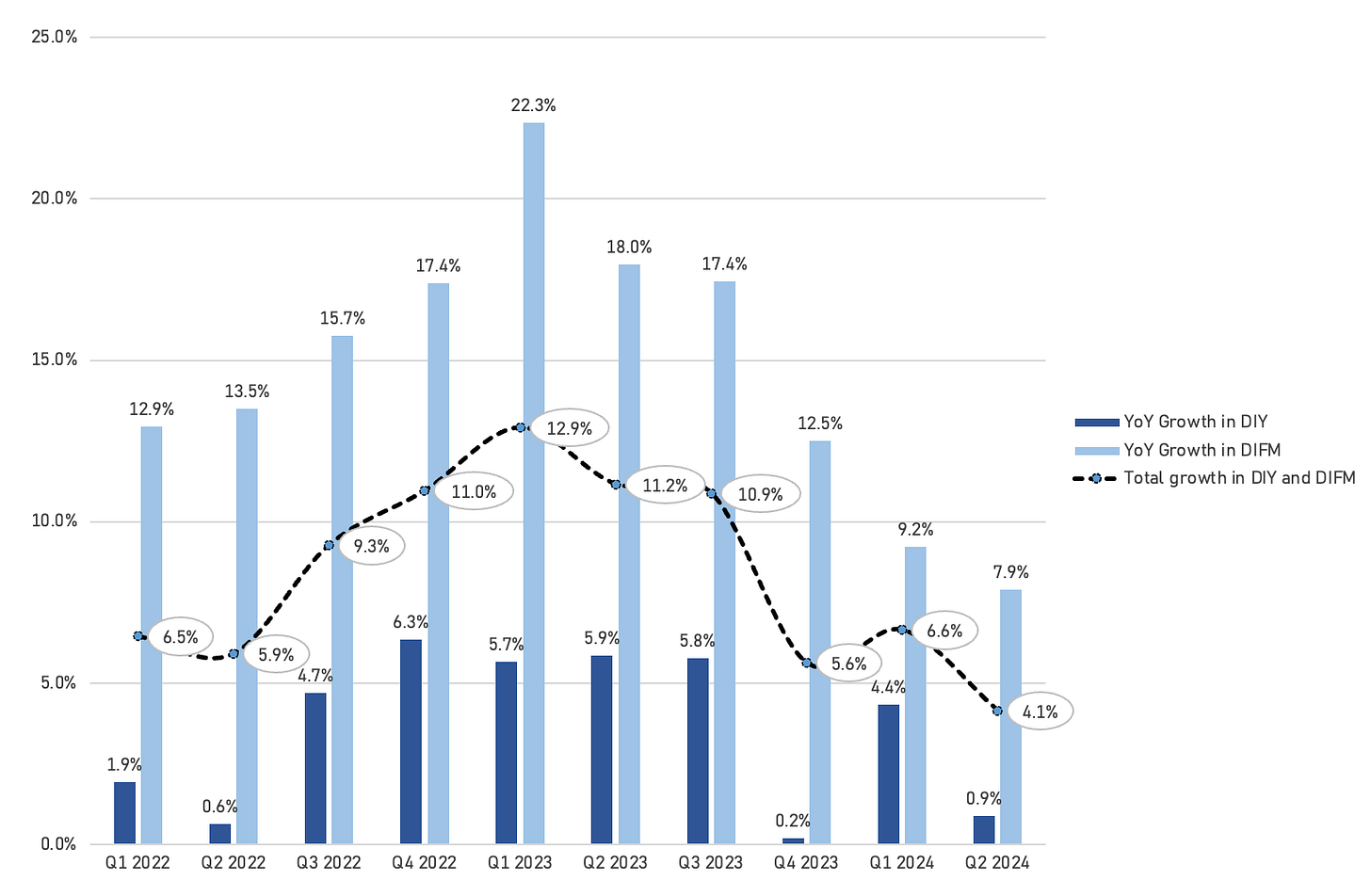 On the DIY side, we've moved past some substantial pricing tailwinds, and demand for discretionary items (such as accessories, chemicals, and appearance products) has normalized. Overall, we believe ORLY has gained and continues to gain significant market share across both segments of the business.