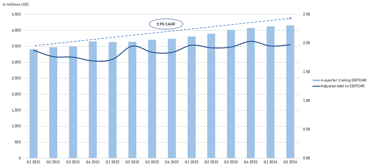 On the leverage side, ORLY hasn’t levered up relative to AZO (which is now at 2.4-2.5x EBITDAR, and that’s helped its EPS growth). As such, there’s more headroom to spending on CAPEX/making strategic investments, and repurchasing stock. At the same time, EBITDAR has grown by 5.9% since Q1 2021 despite the incremental margin pressure we’ve addressed in the above section. Overall, we believe an annual increase in EBITDAR of around 8% beyond FY24 is feasible.