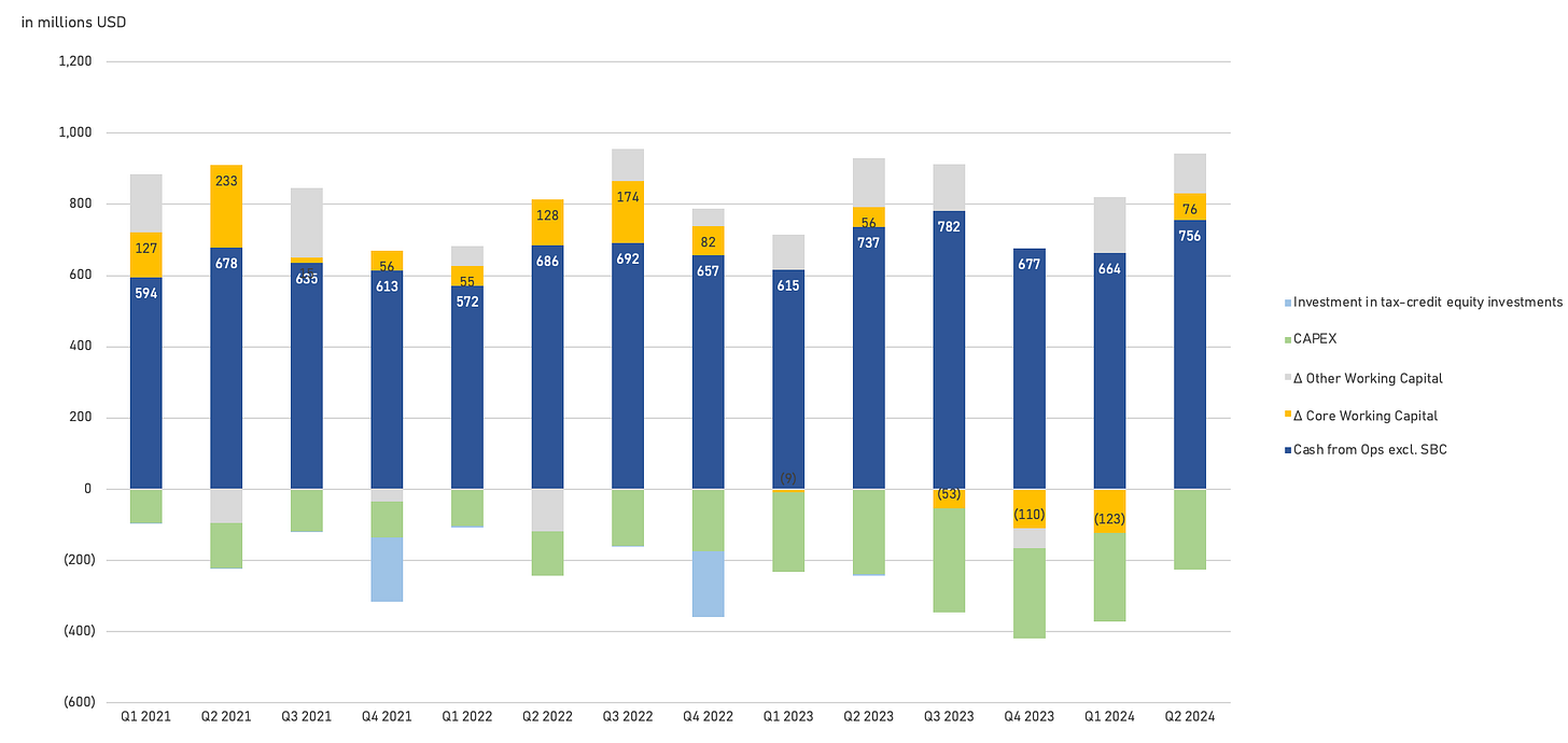 Note: free cash flow calculated as cash flow from operations excluding share-based compensation (i.e. treating it as a cash expense) minus CAPEX, minus tax credit equity investments. Keep in mind that an increase in operating lease assets (excluding the effects of M&A) should be treated as CAPEX (not shown in the below graph), as they are an integral part of invested capital and thus influence ROIC.