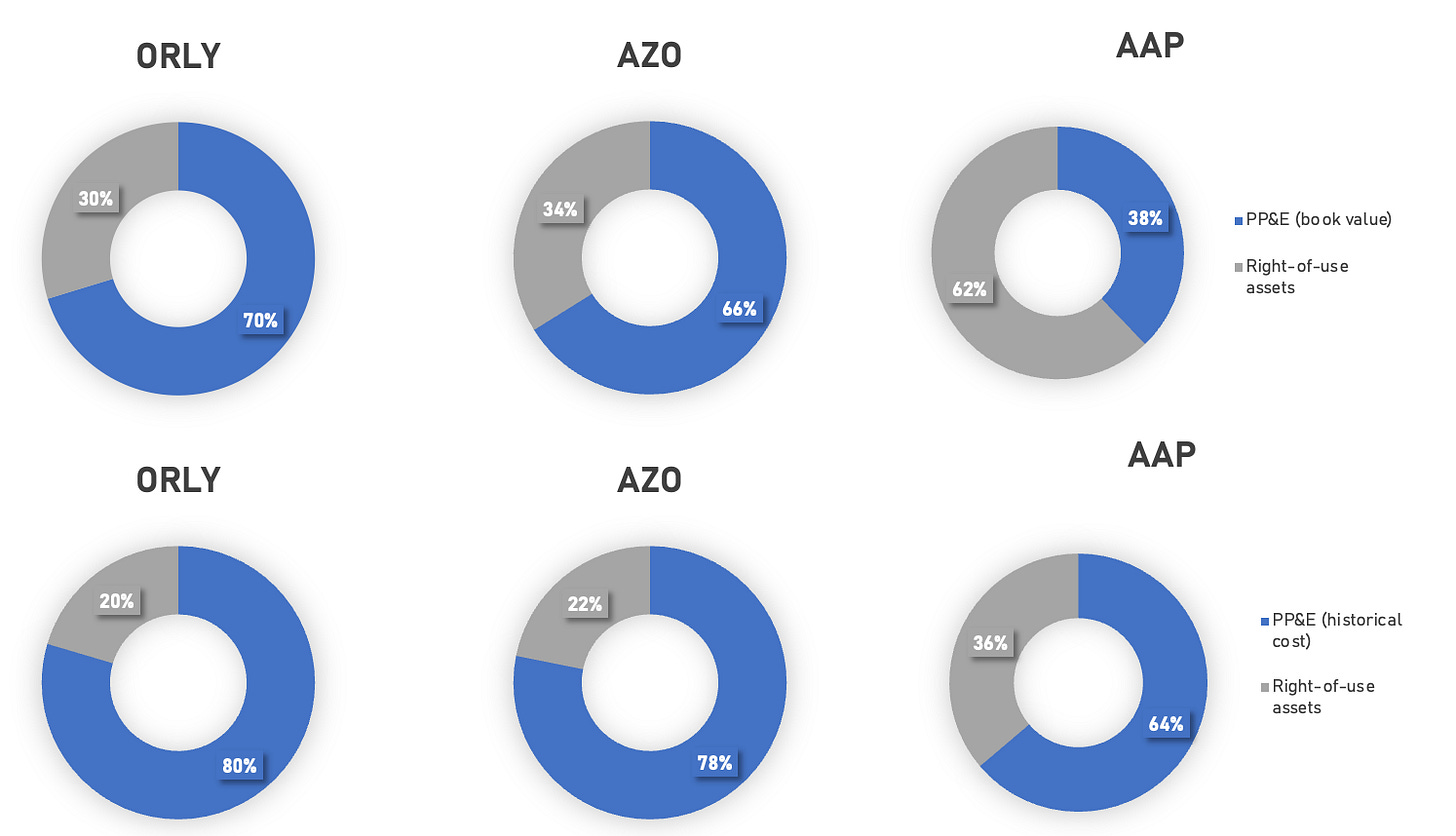 AZO has finance leases (as evidenced by the repayment of lease liabilities in its financing cash flows and higher depreciation), while ORLY has all of its agreements under operating lease.