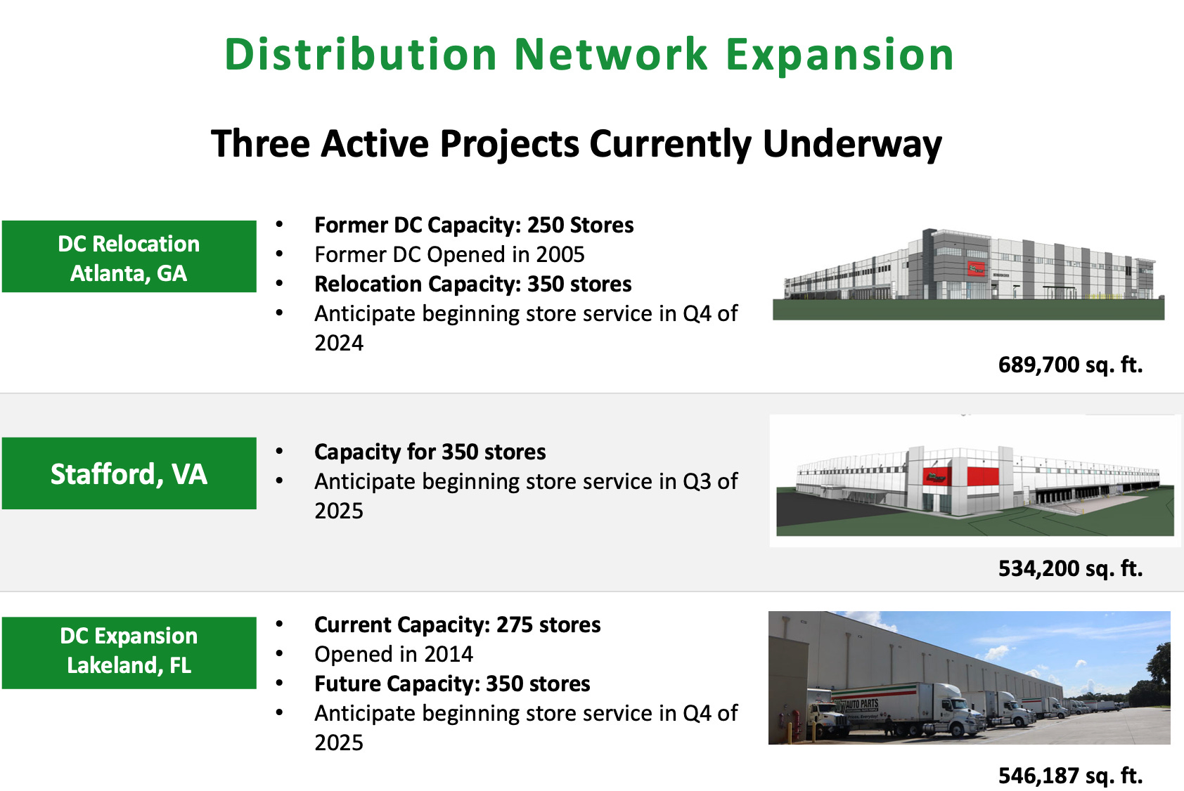 Moreover, 95% of ORLY’s stores receive intraday service from either a servicing hub store or a distribution center (DC) city counter, with multiple runs each day. This ensures that customers receive the parts they need promptly, allowing them to get their vehicles back on the road without delay. On average, a DC serves about 250 stores with five-night-per-week delivery, making ORLY the only company in its industry to offer such consistent service across every location. Additionally, all of ORLY’s distribution nodes have reverse logistics capabilities, enabling the company to effectively manage the product life cycle by adjusting inventory levels as demand changes.