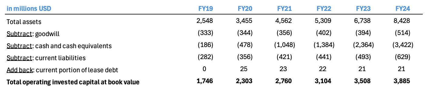 Given that Copart’s recent track record has been driven primarily by organic growth (CAPEX for land, yard facilities, equipment, software, and working capital), we’ve excluded goodwill from our calculations to better reflect the underlying returns.