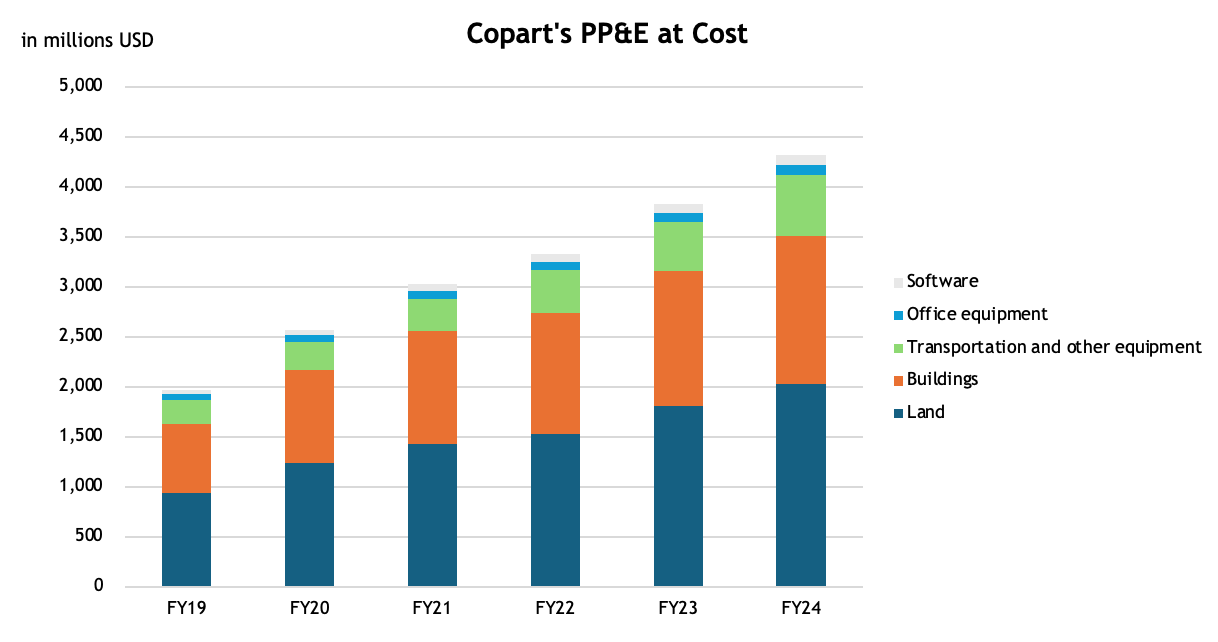As we look at rolling returns, it’s worth remembering that companies with structurally low recurring CAPEX and pricing power have scored very well over the recent years. Their assets, which don’t need frequent replacement (e.g. plants, latest state-of-art machinery) are being depreciated, while NOPAT continues to grow. For Copart, land and buildings account for roughly 82% of its total property, plant, and equipment at cost. Lease liabilities are fairly insignificant relative to the below figures.