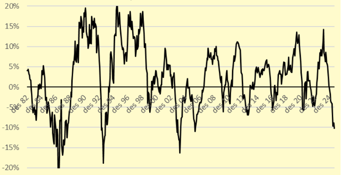 The below graph was shared by Mathias, a highly respected Partner in our Discord community, illustrating the rolling 12-month performance of the MSCI World Quality relative to the MSCI World. If it’s positive, quality has been outperforming the average index (which reflects the aggregate of quality, average quality, and junk), and vice versa.