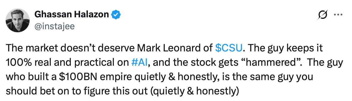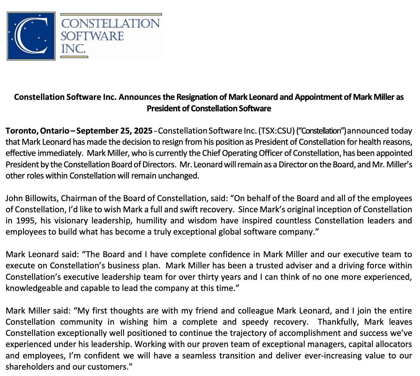 Today, just before the opening bell, CSI (Constellation Software Inc.) issued a press release, announcing the resignation of CEO and founder Mark Leonard as President. First and foremost, we wish him and his family all the very best, and thank him for all his insights, humility, and creating one of the world’s best compounding machines.